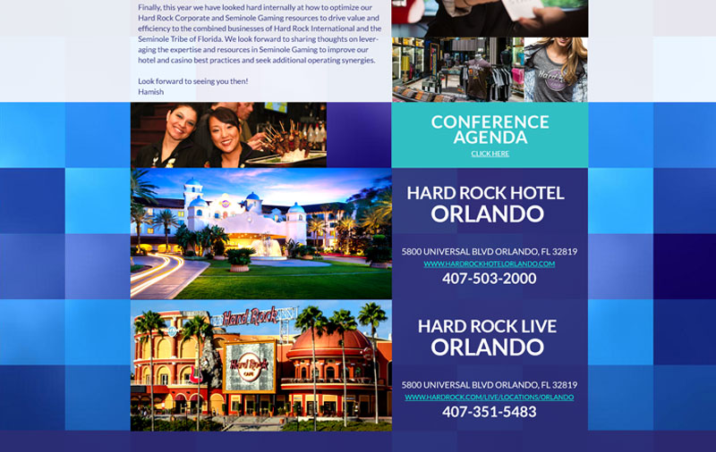 This year’s theme was “Build A Rock Solid Reputation” and held between Hard Rock Live Orlando and Hard Rock Hotel Orlando. Designed for easy navigating on desktop and mobile. Inspired by the logo colors and images from across the entire Hard Rock brand.