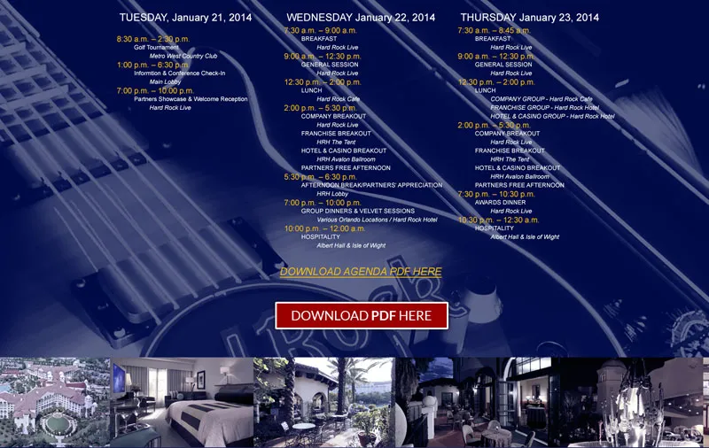 Transitioned Hard Rock’s global conference websites from static builds to WordPress CMS. Created Photoshop designs and implemented them in WordPress, utilizing the platform’s native capabilities for dynamic content elements including sliders, accordions, and galleries. This shift significantly improved development speed and ongoing content management for future conference iterations.
