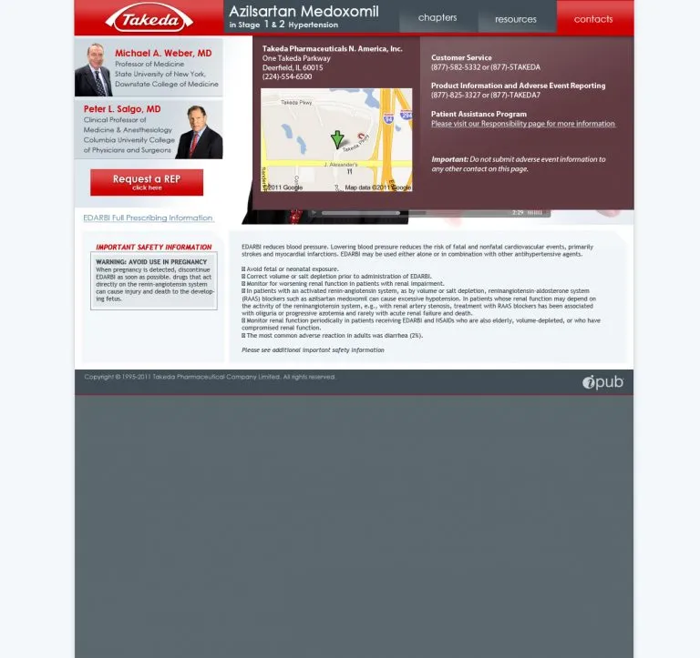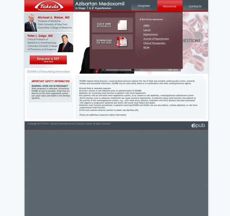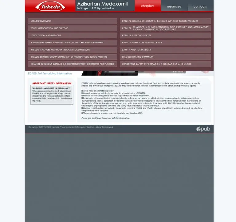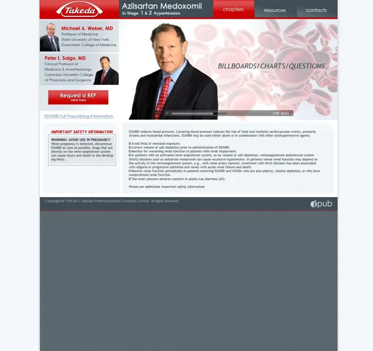 Designed and developed an interactive medical education experience for Takeda Pharmaceuticals’ hypertension treatment EDARBI (azilsartan medoxomil), delivered through Creative Force Video Productions. The project went beyond a standard video carousel it combined physician-led video content with interactive clinical assessment questions, creating a continuing medical education (CME)-style experience for healthcare professionals.