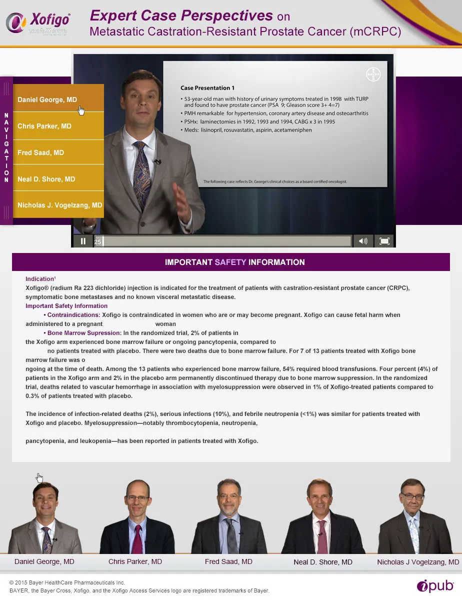 Designed and developed an expert case perspectives platform for Xofigo® (radium Ra 223 dichloride), a Bayer HealthCare Pharmaceuticals oncology treatment for Metastatic Castration-Resistant Prostate Cancer (mCRPC), delivered through Creative Force Video Productions.